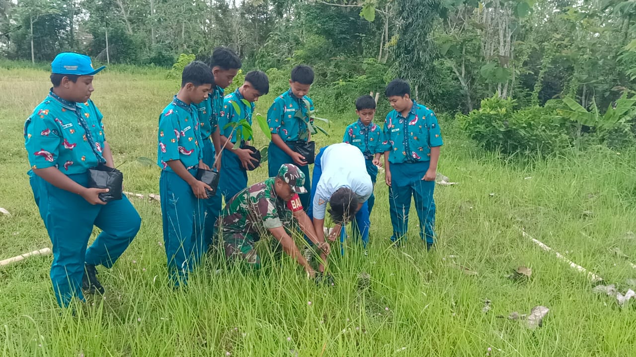 Blitar – Babinsa Desa Ngeni Subramil Wonotirto Koramil 0808/09 Sutojayan Serda Aga Panoto bersama para siswa SMPN 2 Wonotirto Desa Ngeni melaksanakan kegiatan penanaman pohon trembesi, Selasa (6/1/2026). Kegiatan ini merupakan bagian dari upaya mendukung program Manunggal Alam yang bertujuan menjaga kelestarian lingkungan sejak dini.