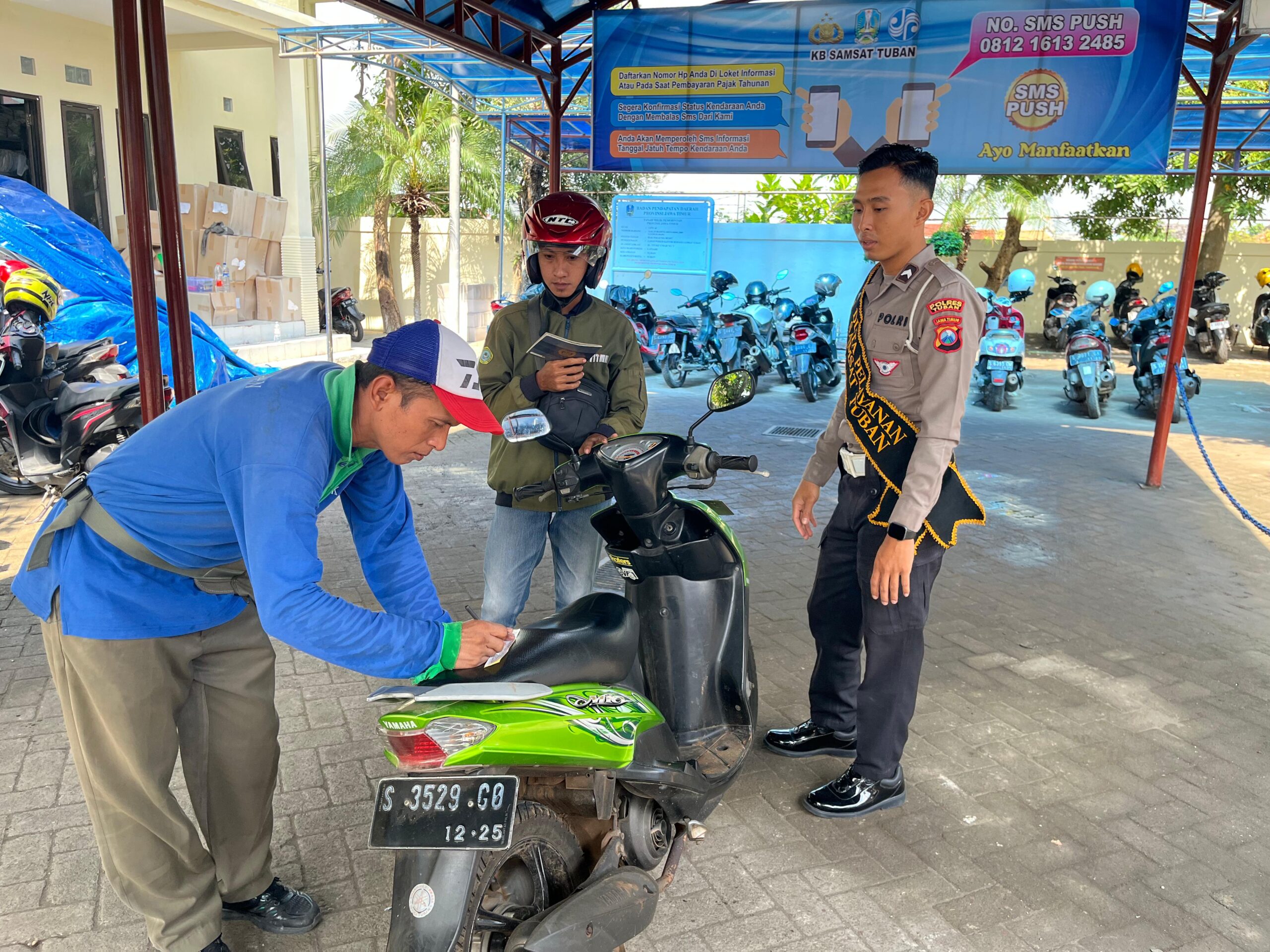 Petugas memberikan penjelasan lengkap mengenai pembuatan dan perpanjangan Surat Izin Mengemudi (SIM), pembayaran pajak kendaraan, hingga pengurusan Buku Pemilik Kendaraan Bermotor (BPKB). Informasi disampaikan secara sederhana agar mudah dipahami oleh semua kalangan.