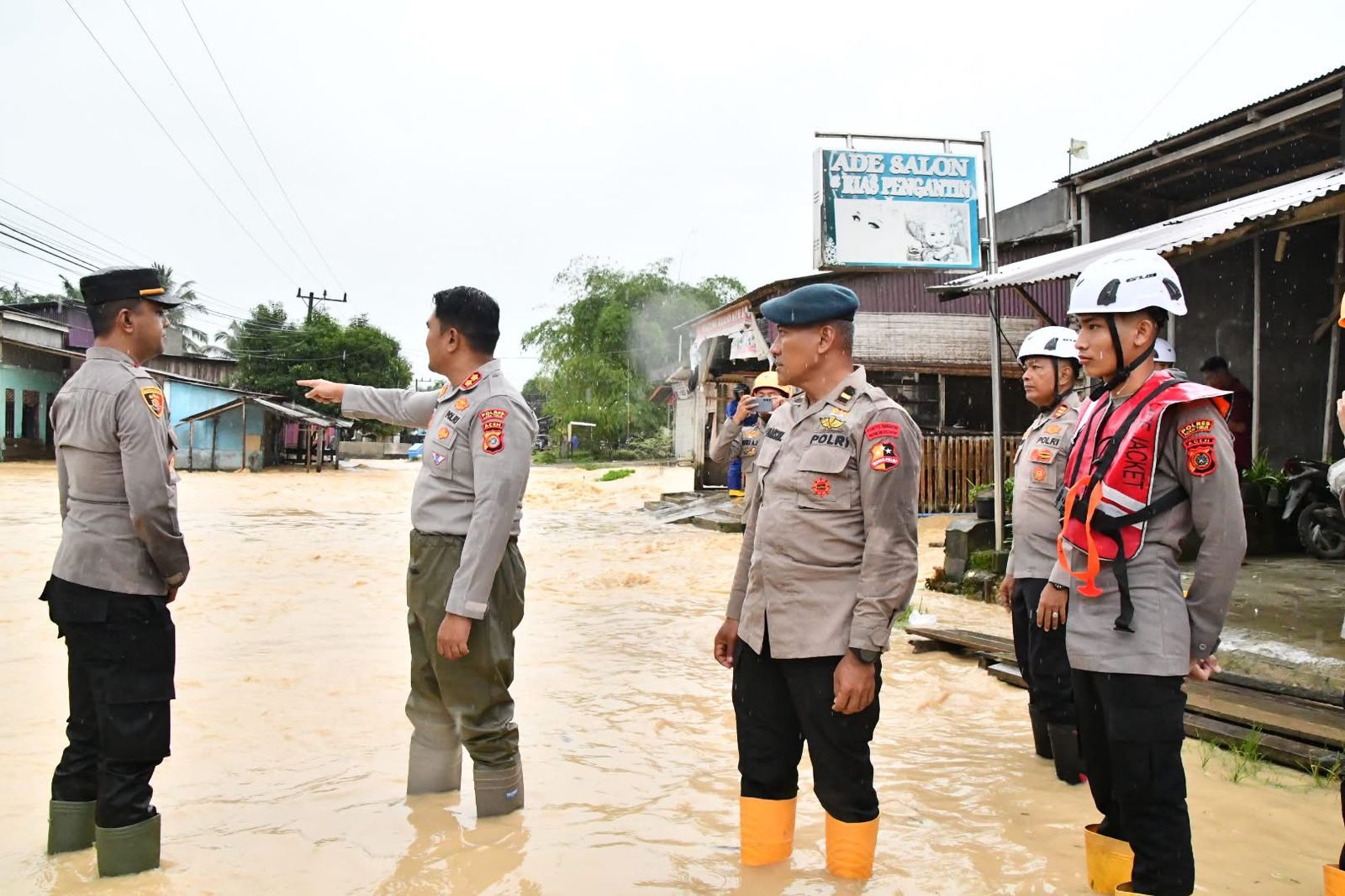 Didampingi sejumlah pejabat utama dan Danton BKO Brimob Resimen I Kedung Halang, Ipda Samsul, Kapolres Aceh Timur menerobos genangan air yang sudah merendam badan jalan.