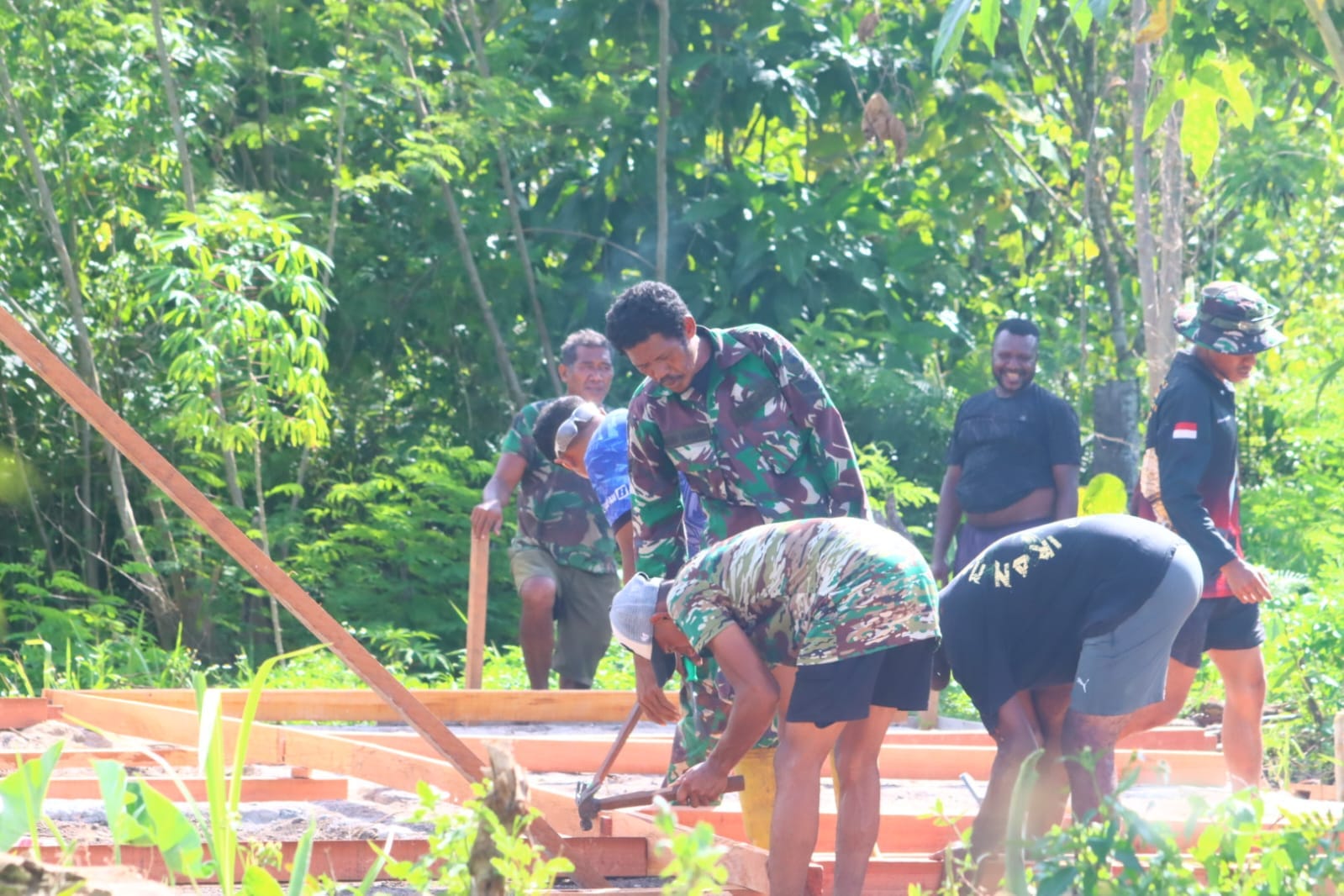 Semangat gotong royong juga ditunjukkan oleh Yulianus yang turut terlibat langsung dalam proses pembangunan rumahnya. Kebersamaan ini menjadi wujud nyata kemanunggalan TNI dengan rakyat yang terus terjaga.