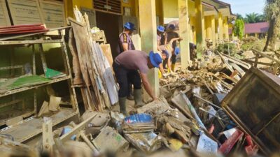 Polda Aceh melaksanakan kegiatan pembersihan fasilitas pendidikan di Kabupaten Aceh Tamiang.